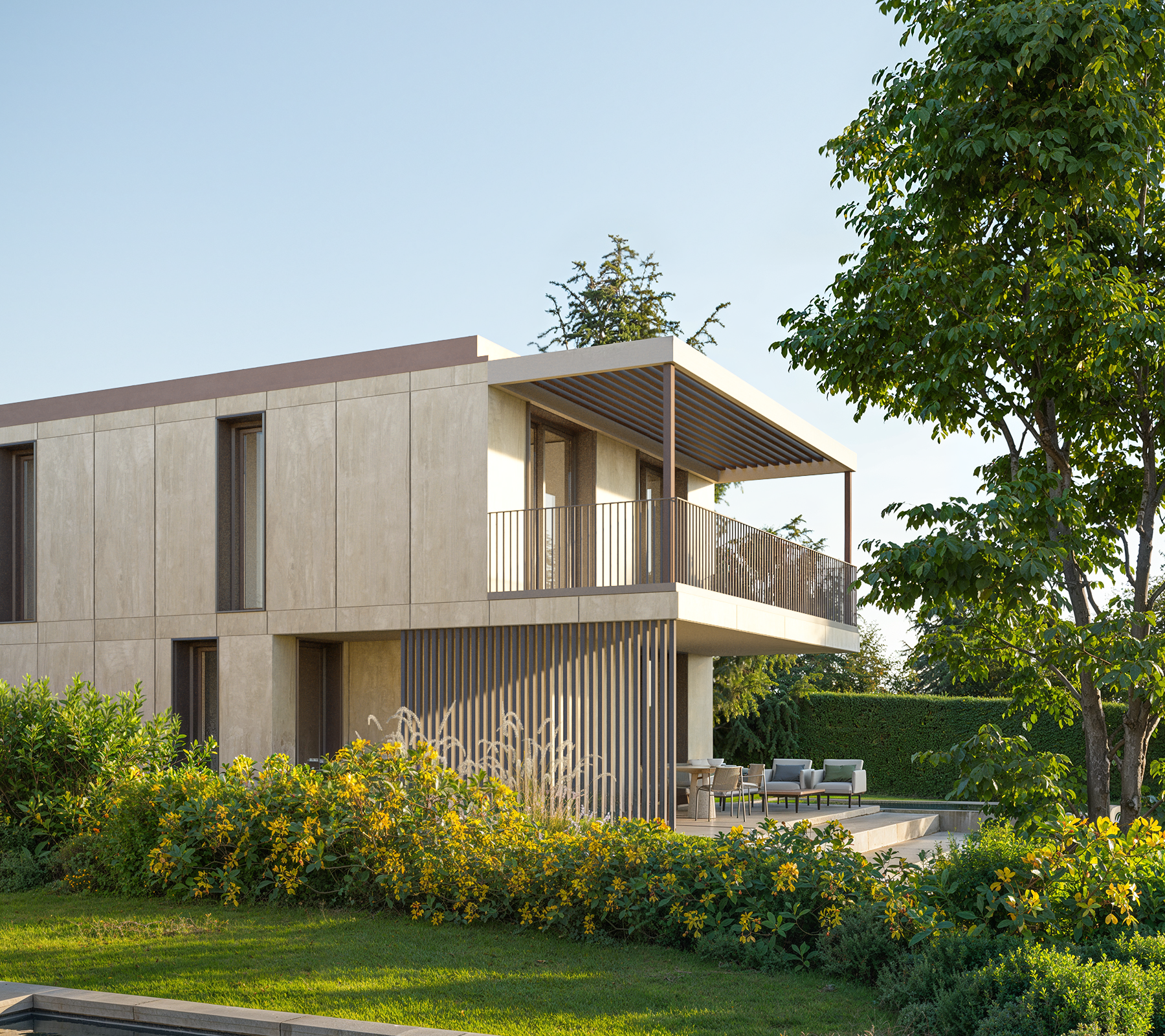 Les façades aux teintes douces se marient harmonieusement avec l’environnement, tandis que les grandes ouvertures favorisent la lumière naturelle.