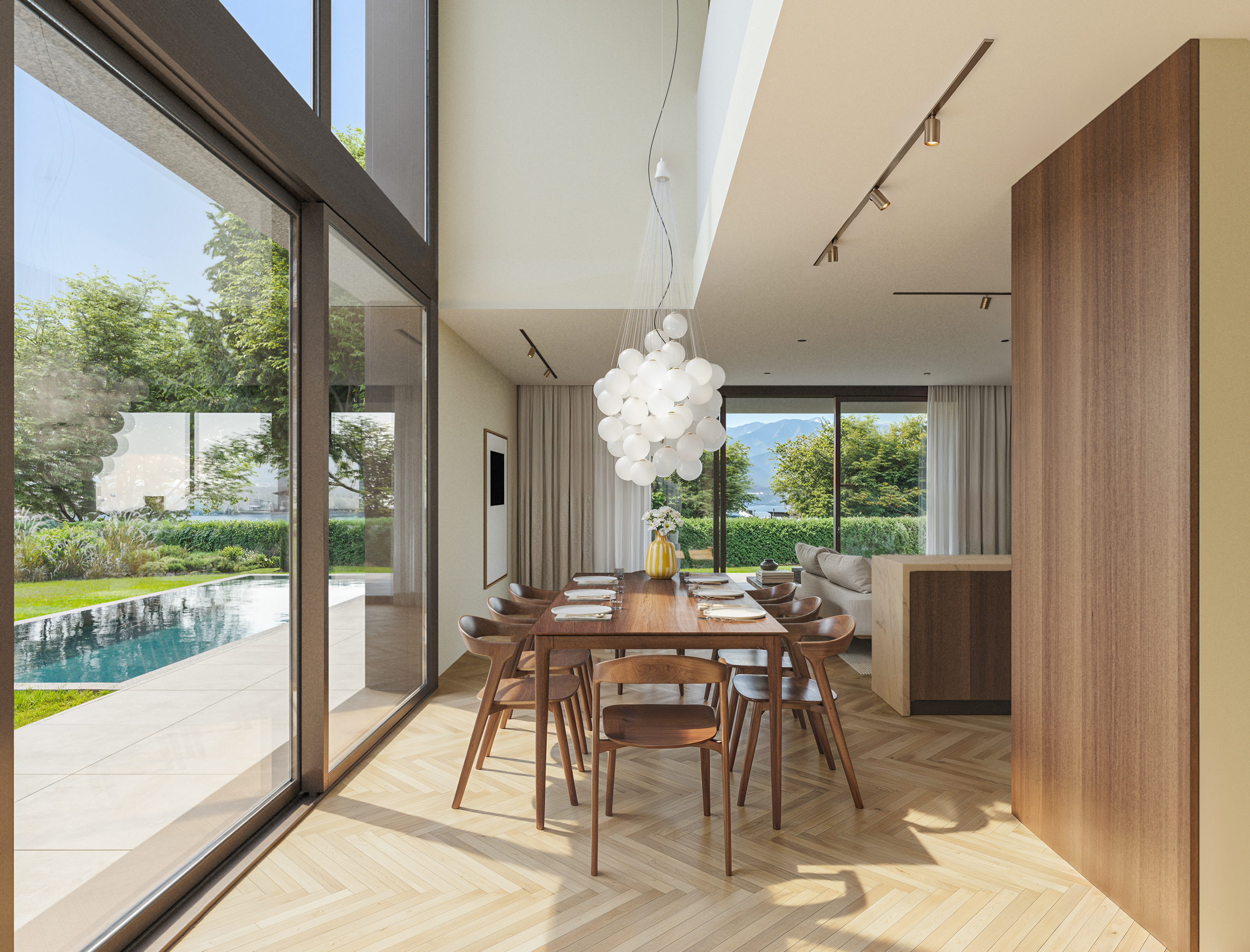 Les larges baies vitrées prolongent l'espace intérieur vers les terrasses et les jardins, effaçant la frontière entre l’intérieur et l’extérieur.